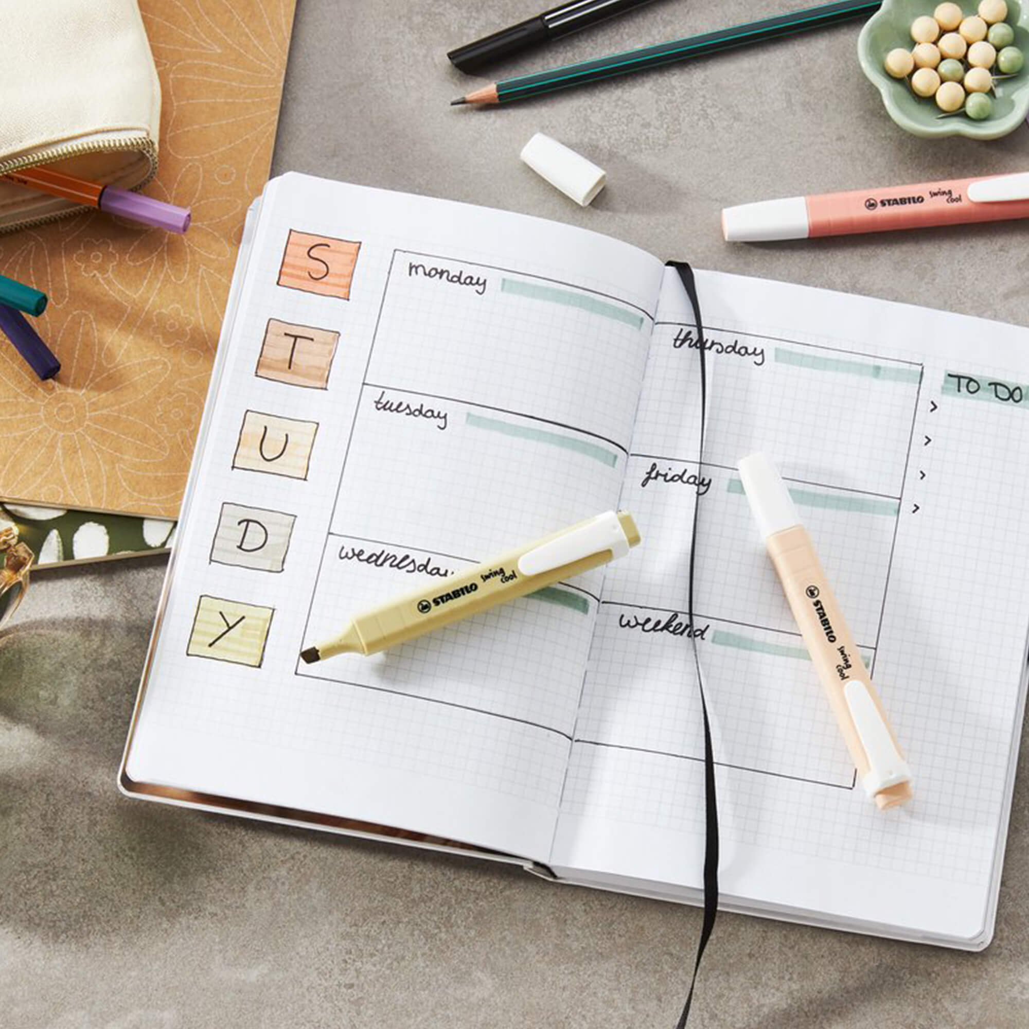 Je kunt met deze tekstmarkers markeren én onderstrepen (en zelfs tekenen!) doordat de lijndikte kleiner is dan de andere markeerstiften in deze shop. De schuine punt van deze stiften geeft een fijne en precieze lijn van 1.0 tot 4.0 mm. Perfect om alles kleurrijk te highlighten, te kleuren of te tekenen! Extra leuk voor de creatieveling of als je liever smalle markers gebruikt. Markeer dezelfde soort activiteiten op jouw dag- of weekplanner en creëer op die manier nog gemakkelijker overzicht. Met deze etui heb je ruim voldoende keuze om al jouw verschillende activiteiten (tot een maximum van zes) een andere kleur te kunnen geven.